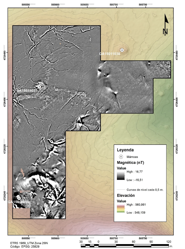 Para la exploración de la zona se empleó un gradiómetro de flujo equipado con dos sensores. Se recurrió a una toma de datos basándose en cuadrículas de 30 × 30 m que cubrieron la gran parte de las zonas de trabajo. En total se plantearon 4 cuadrículas, con una superficie prospectada de 3600 m². En su conjunto los trabajos realizados ofrecieron resultados positivos por lo que respecta a la detección de estructuras enterradas. cabe destacar en este sentido la identificación de varias estructuras relacionadas con el asentamiento roano, y que han hecho posible delimitarlo por su parte Norte.