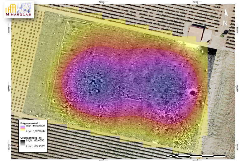 El objetivo de la campaña fue realizar trabajos de prospección geofísica con la finalidad de delimitar y caracterizar la zona arqueológica detectada en la parcela, así como evaluar su estado de conservación y valorar la potencial afección a los restos causada por las labores agrícolas. El método elegido para realizar el trabajo fue la prospección geomagnética, ya que se trata de un método que permite realizar una exploración rápida de grandes superficies, y que además es particularmente flexible y adaptable a todo tipo de terrenos. En cualquier caso una aproximación no invasiva para la realización de un diagnóstico de una zona arqueológica no puede entenderse a través de la utilización aislada de una o varias técnicas, sino que requiere de un análisis integrado de toda la información. En este sentido ha sido importante la valoración de los datos aportados por la prospección de superficie. Gracias al geo posicionamiento de todos los hallazgos identificados ha sido posible generar una estimación de la densidad de materiales para la totalidad de la parcela. A partir de esos datos, se han podido descartar las áreas con total usencia de indicios, así como establecer con precisión las concentraciones de diversa entidad que indicaban, al menos, los puntos en los que los niveles arqueológicos habían sido más dañados por la actividad agrícola.