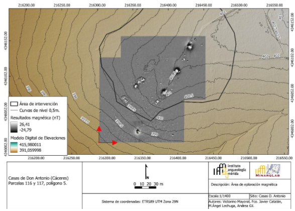La intervención fue encomendada al laboratorio de Arqueología no invasiva MINARQLAB, perteneciente al Instituto de Arqueología de Mérida (IAM-CSIC), por parte de la empresa ANTA TRABAJOS DE ARQUEOLOGÍA, S.L. como parte de los trabajos preventivos en dicha parcela previos a la implantación de un olivar intensivo por la empresa Oleum.